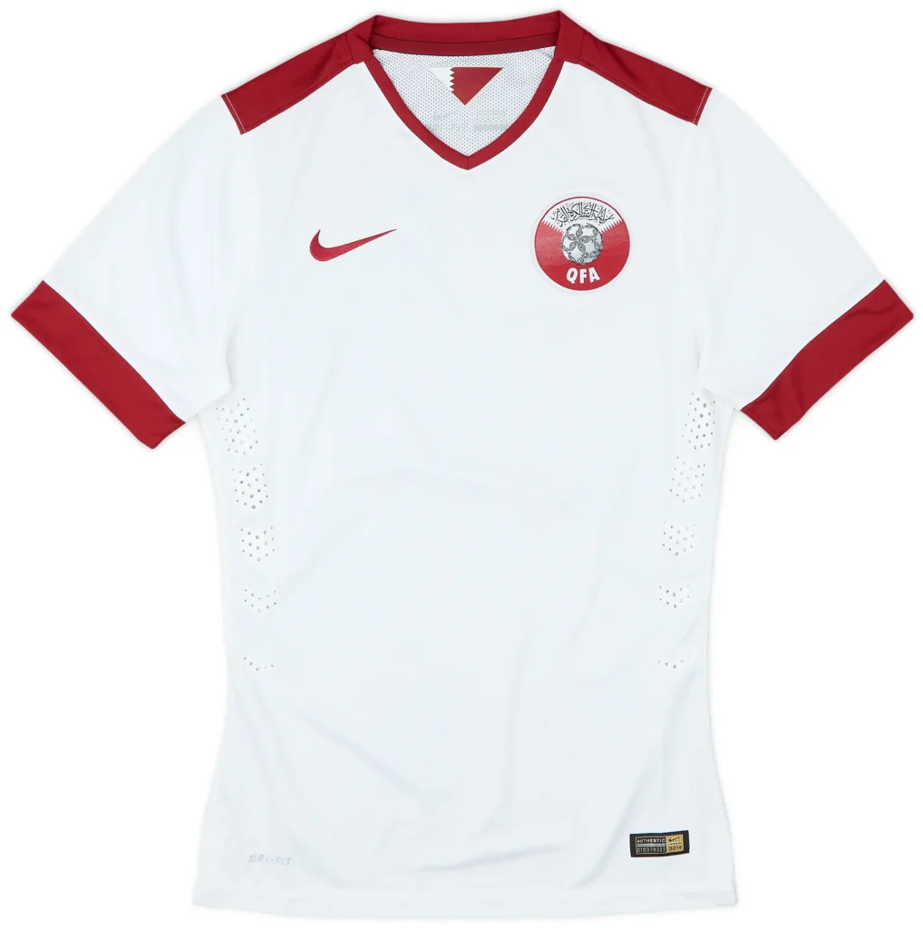 This white away kit featured clean maroon accents and a simple, modern design that focused on clarity and comfort. Players wore it during regional competitions and international friendlies, showing discipline and teamwork. The lightweight fabric improved comfort, airflow, and movement on the pitch. Fans appreciated its minimal look, balanced colour scheme, and easy visual appeal. It reflected Qatar’s steady development in international football. The jersey remains memorable for its simplicity, elegance, durability, and role during a key period of growth and preparation for bigger global challenges ahead.