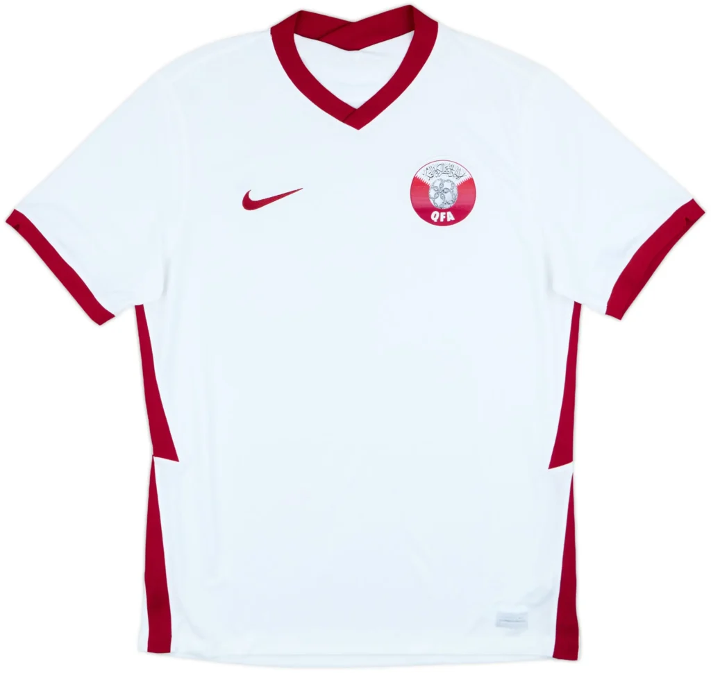 This white away kit introduced sharper maroon detailing, a refined structure, and a more athletic silhouette for better performance. Players wore it in World Cup qualifiers and international friendlies, showing improved tactical awareness. The design reflected a modern approach to football kits with enhanced materials. Fans praised its sleek appearance, smooth texture, and comfortable fit. It symbolised Qatar’s progress in both style and performance levels. The jersey remains a fan favourite for its clean design, reliability, and strong connection to a developing and ambitious football era.
