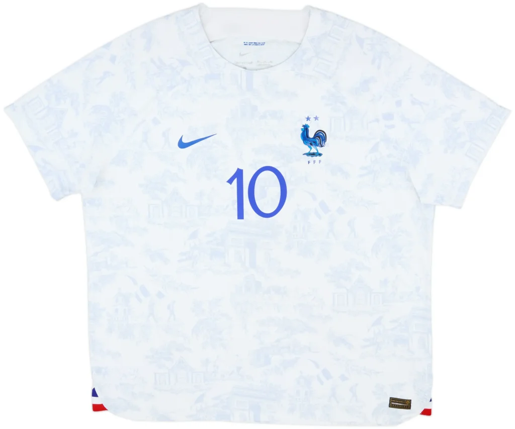 This creative white away kit featured abstract patterns inspired by French culture and artistic heritage. Mbappé wore it during major World Cup fixtures and international tournament appearances. The design blended modern football fashion with technical performance innovation. Fans praised its unique visual identity and premium construction quality. It symbolised France’s ability to combine tradition with bold creative expression. This jersey reflected tactical intelligence, team unity, and a confident approach to modern international football competition.