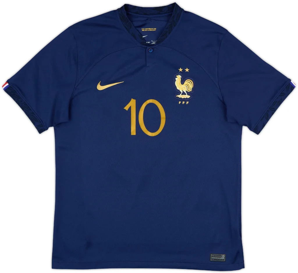 This navy blue home kit introduced gold detailing, bold typography, and a powerful modern aesthetic. Mbappé wore it during World Cup matches and key international qualification fixtures. The design reflected championship ambition, tactical confidence, and strong national symbolism. Fans admired its contemporary styling and commanding presence on the pitch. It showcased France’s attacking intensity and disciplined defensive structure. The jersey represented a progressive era defined by innovation, resilience, and a continued pursuit of global football dominance.