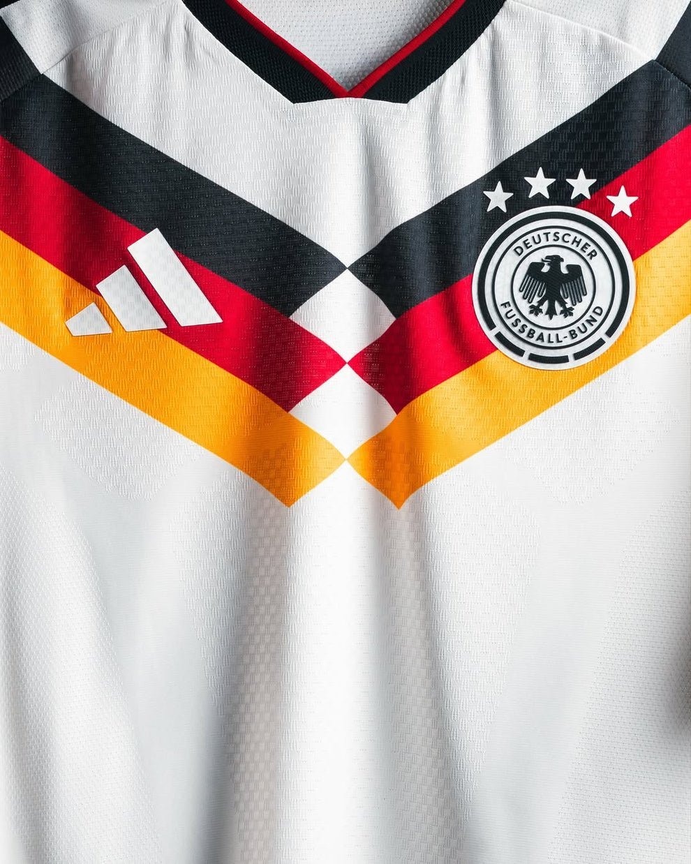 The jersey features a clean, classic white base that honors Germany’s football tradition. Across the chest is a bold, multicolored diamond (“V”) motif in black, red, and gold — a clear tribute to the German flag and past iconic World Cup kits.