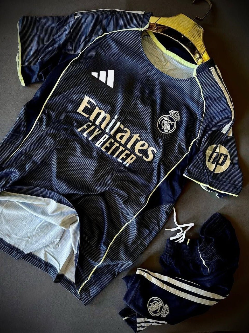 The Real Madrid 2025/26 Away Set (With Shorts) brings a fresh new look while keeping the elegance and confidence the club is known for. This season’s away design combines modern patterns with a stylish color scheme that reflects Real Madrid’s bold and global identity. Made from high-quality, lightweight material, it ensures great comfort and breathability during matches, training, or casual wear.